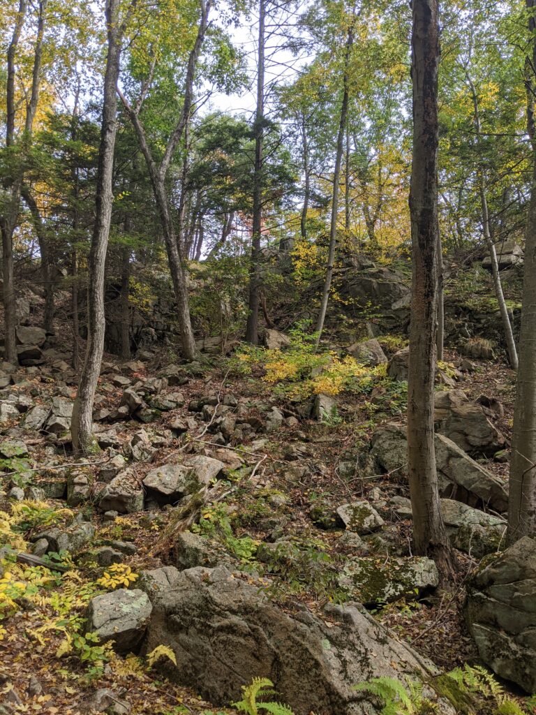 I followed this trail east until I came to intersection 19, where I turned right (south) onto RT. At this point RT turned into more of a traditional hiking trail than the carriage trails I was previously on. My first POI was the Indian Rock Shelter. I wasn't sure what to expect, but I was a little underwhelmed. The layout of the rocks doesn't seem to offer much shelter at all, but it was still neat to photograph.