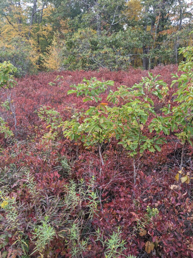 I followed the Blue trail south, first down a sharp descent of rocks from the tower area, then on a mostly flat path. I reached intersection #17 and saw Gilmore Pond on the map. I walked down to explore, but sadly this is on private property and I wasn't able to get to the shore line. Along with the "No Trespassing" signs was a sign warning about giant snapping turtles. I wonder if that's true or just a scare tactic.