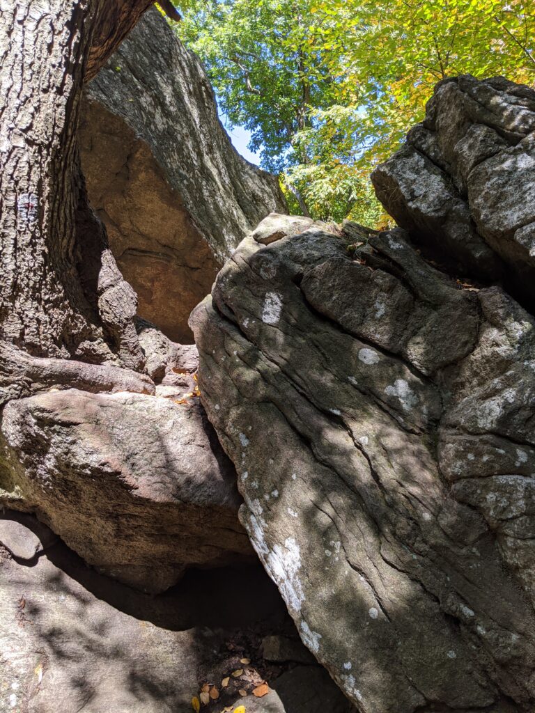 I continued along AT for about another 1/2 mile to reach the Lemon Squeezer. This is a series of rock formations along the trail that one has to "squeeze" through. It starts with a small tunnel between two rocks which was easy to fit through. Then comes the fun part! There's a trail set between two very tightly-spaced rocks. I would estimate they're about 2 feet apart from each other and they get tighter as you head north. I had to turn sideways to fit through at the top, and even then my backpack was scraping against the rock wall. The best way to tackle this is to hoist yourself up out of the crevice as soon as you can't fit anymore. It's not terribly difficult, but it's something different.