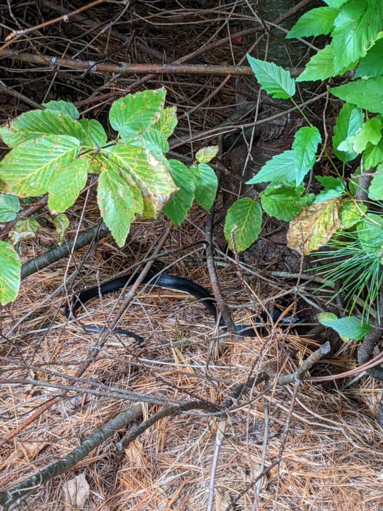For about a mile, this section of the trail has both LP and AS blazes until it hits the 5-way intersection with the Ramapo - Dunderberg (R-D), running north and south. From here, LP and AS split. I decided to take LP to the southeast through Hogencamp Mountain. At one point along the way, I heard movement to my left, stopped, and spotted a snake laying just off the left side of the trail. After looking it up when I got home, it appears that it was a black rat snake, a nonvenomous snake commonly found in New York state. After the snake, I came across a rectangular rock formation. I'm not sure if it was the foundation to a building or laid out for another purpose.