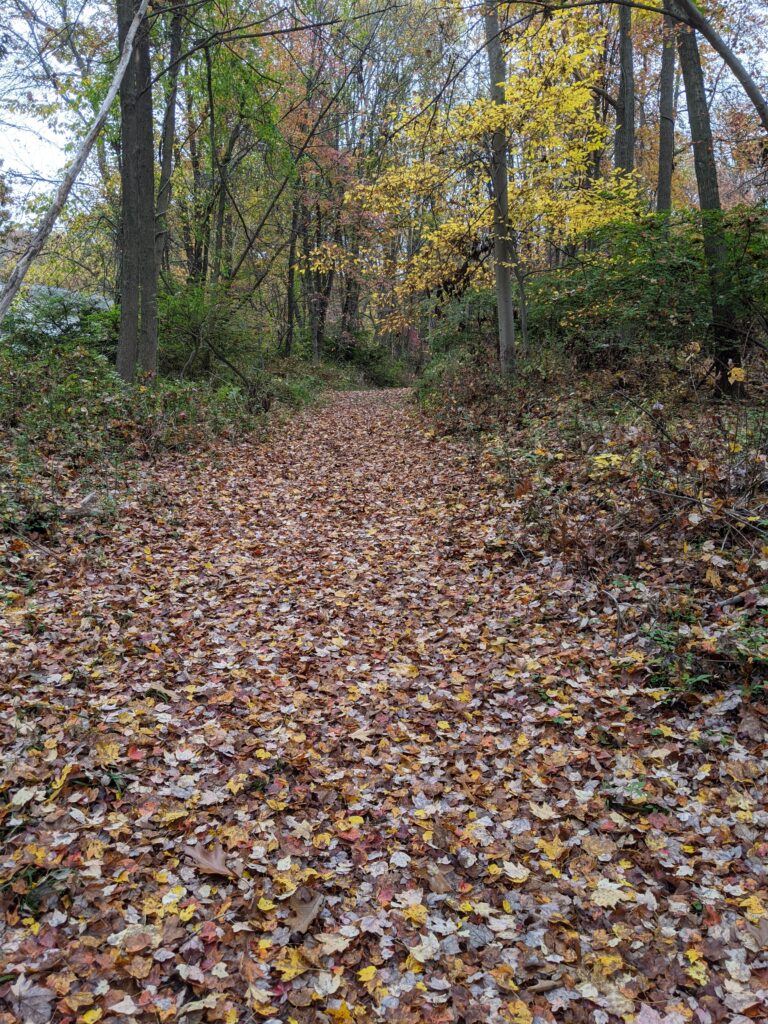 After descending back down the hill, I followed LL to intersection 28, made a left, continued on LL to intersection 26, making a right there and following LL to the end at intersection 31. From there I made a left onto the Red and Green trail. I took Red and Green to the north, almost hitting the Michigan Road parking lot again, but making a sharp right onto the Red and Yellow trail at intersection 70.
