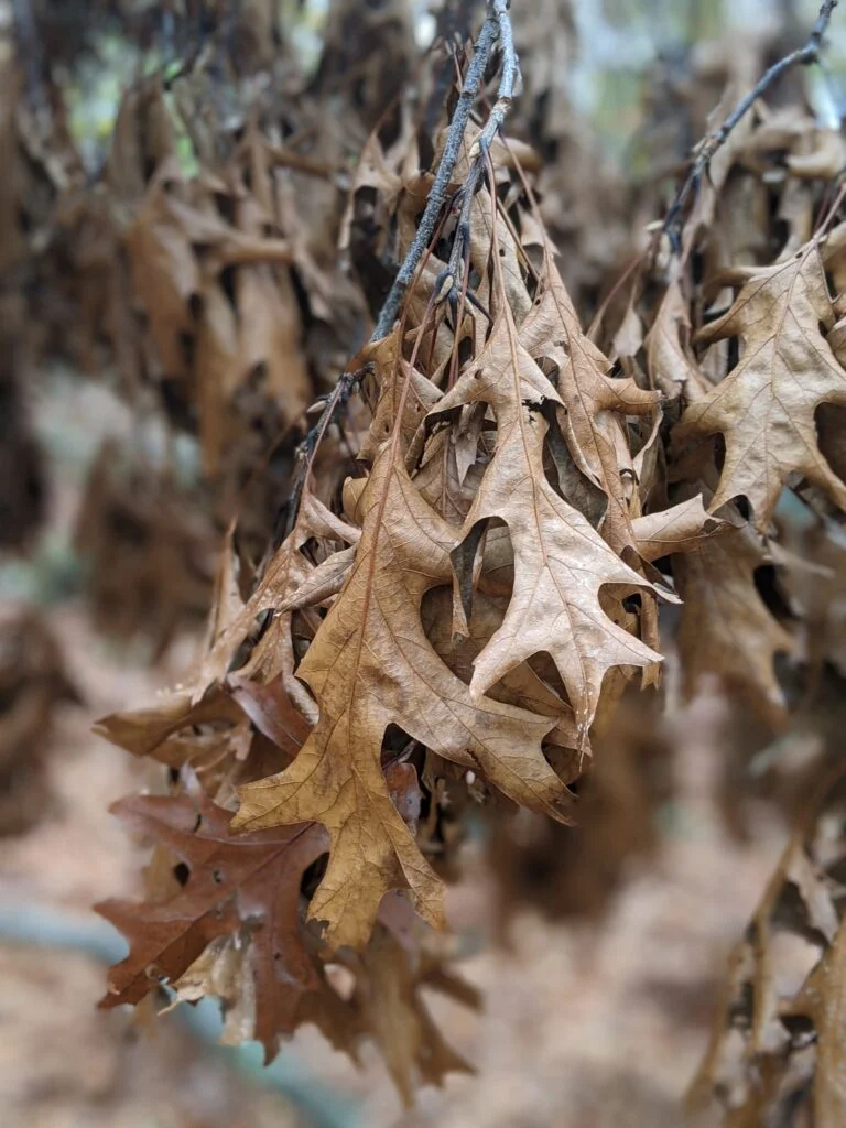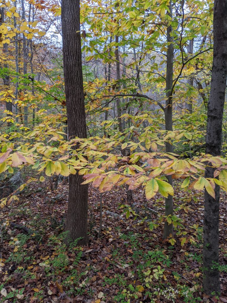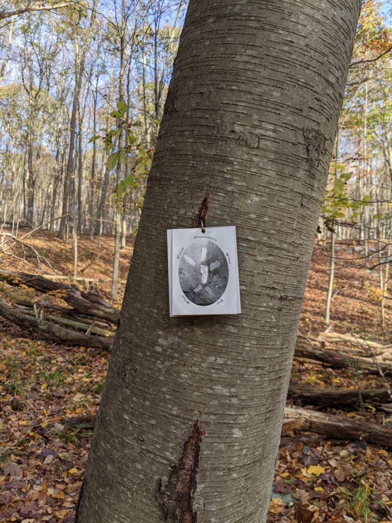 At intersection 10, I connected with the Orange trail and things got interesting. I came upon a sign welcoming me to the Ward Pound Ridge Reservation Upland Phenology Trail. As explained on the sign, phenology is the study of seasonal changes during the life cycle of plants and animals. As I walked along the trail, several plants and trees were identified with markers. The idea is to visit several times a year and watch the changes that occur with the seasons.