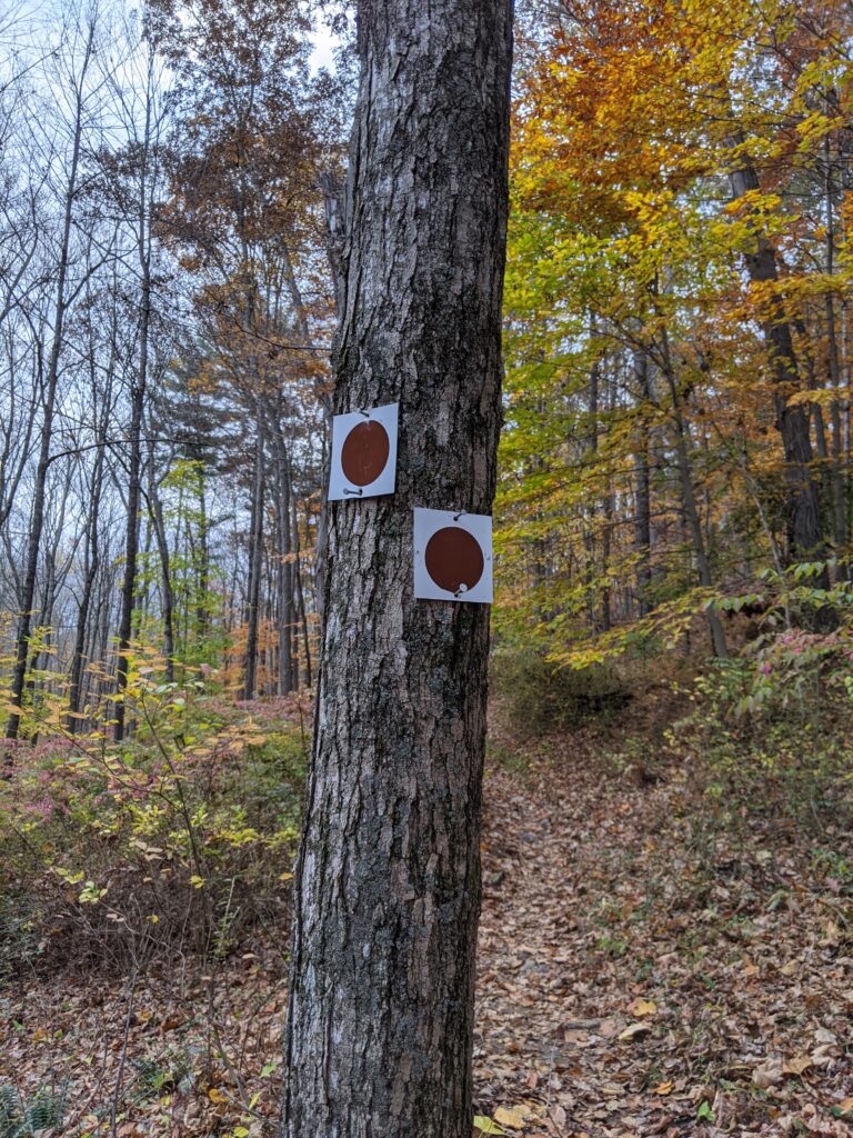 I barely found the White Trail Connector (unblazed) near the portable restrooms in the parking lot. This is a very narrow trail that I probably wouldn't have found without the help of GPS. With all the leaves covering the ground, it's getting hard to spot and follow some of these trails, but enough grass and plants were stomped down to make it out. A quick 2/10 of a mile put me onto the White Trail to Campsite Connector (white blazes), which I took to the right (north), making my way towards intersection 55.